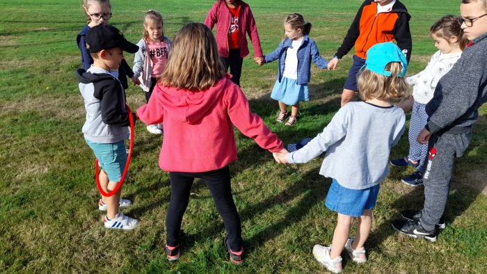 Cette première rencontre nous a permis de faire connaissance : chaque MS et chaque GS constitue un binôme avec un CE2. Ce jeudi, nous nous sommes également entraîner au jeu du cerceau pour le lendemain.