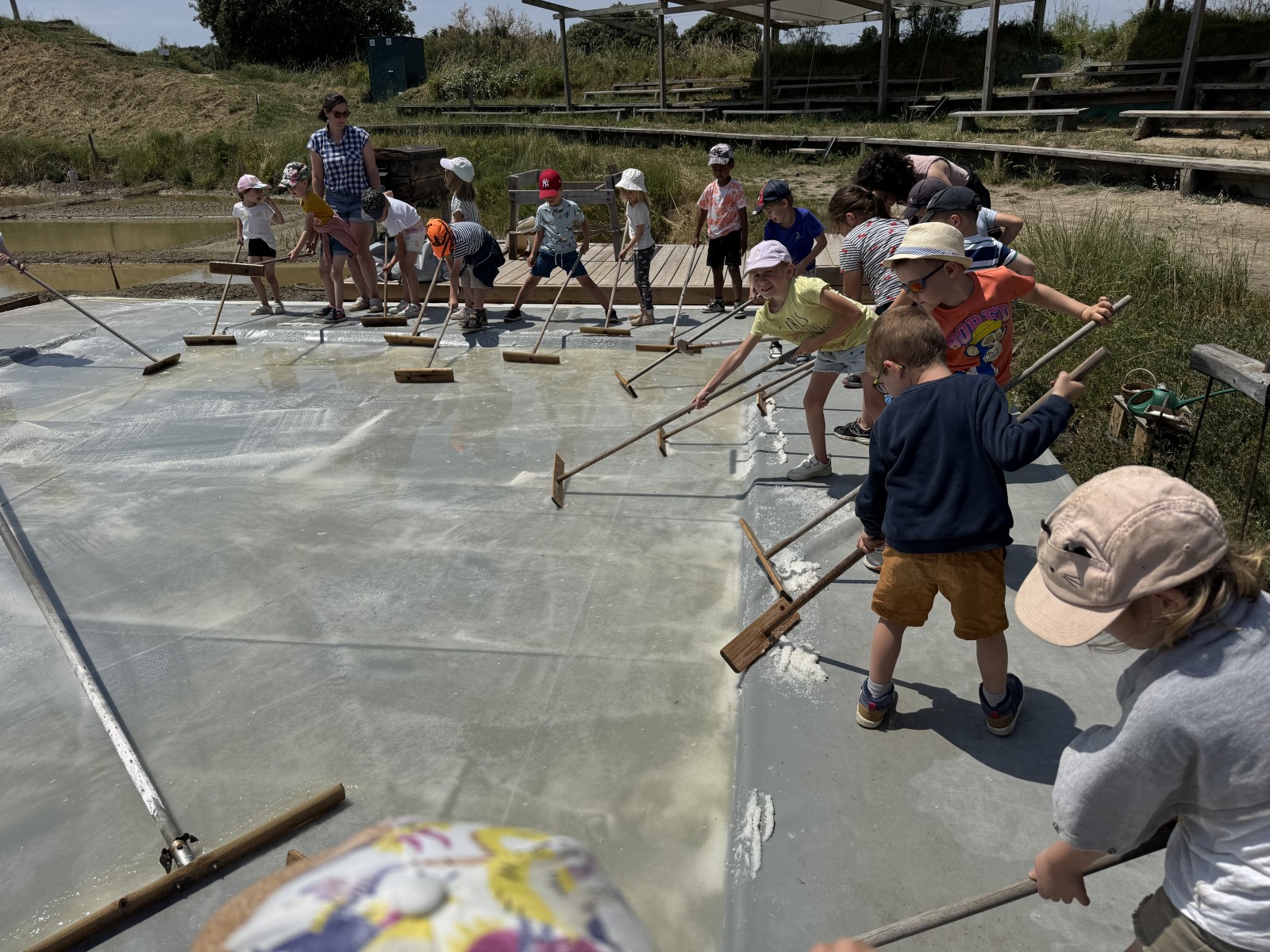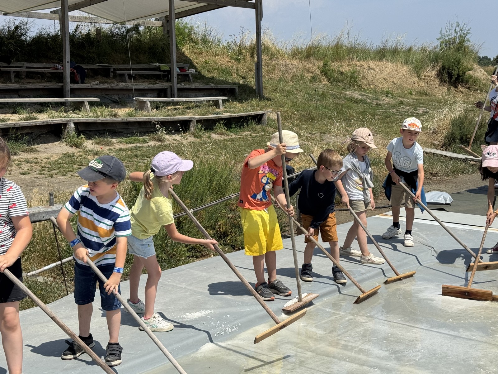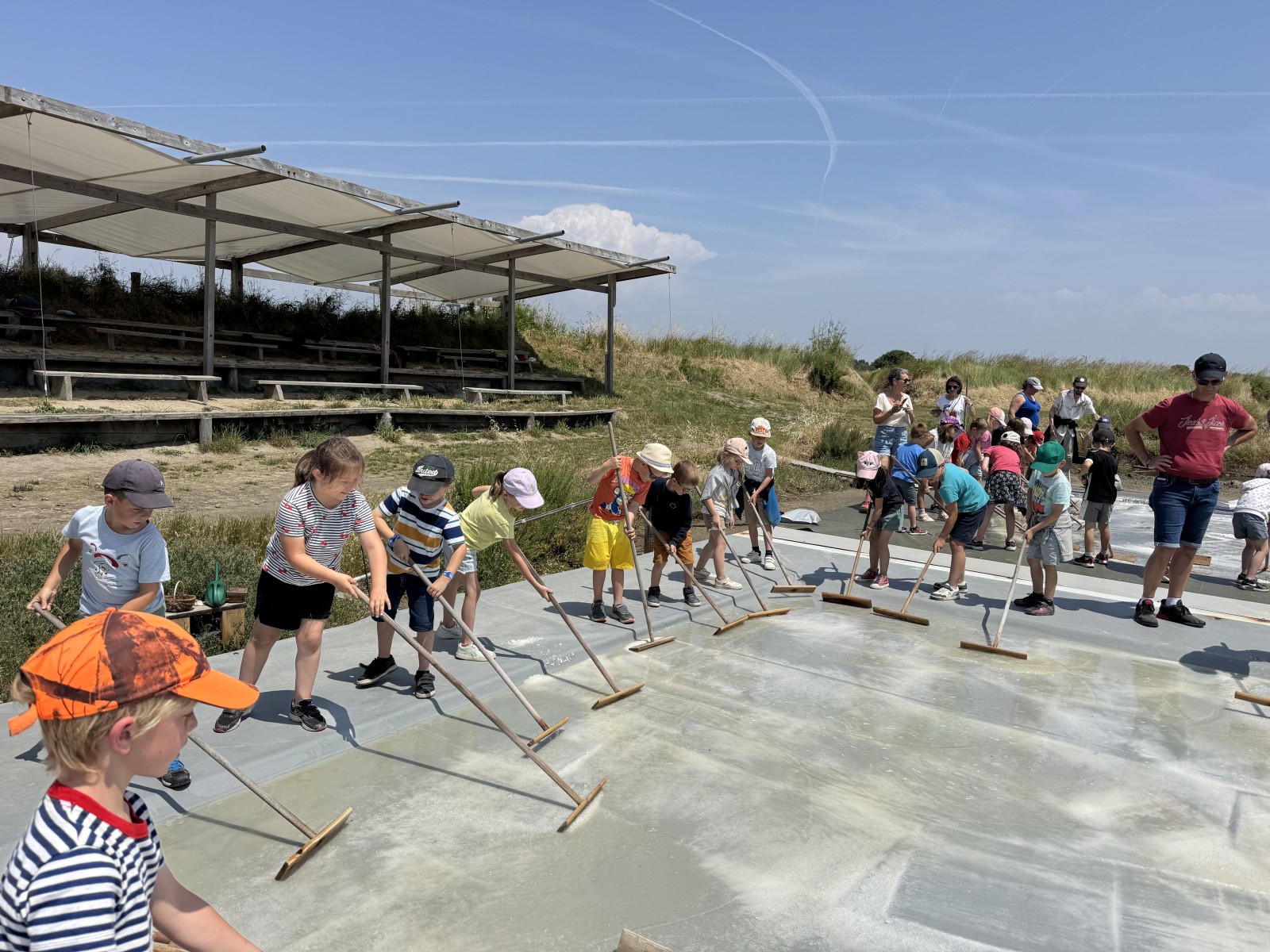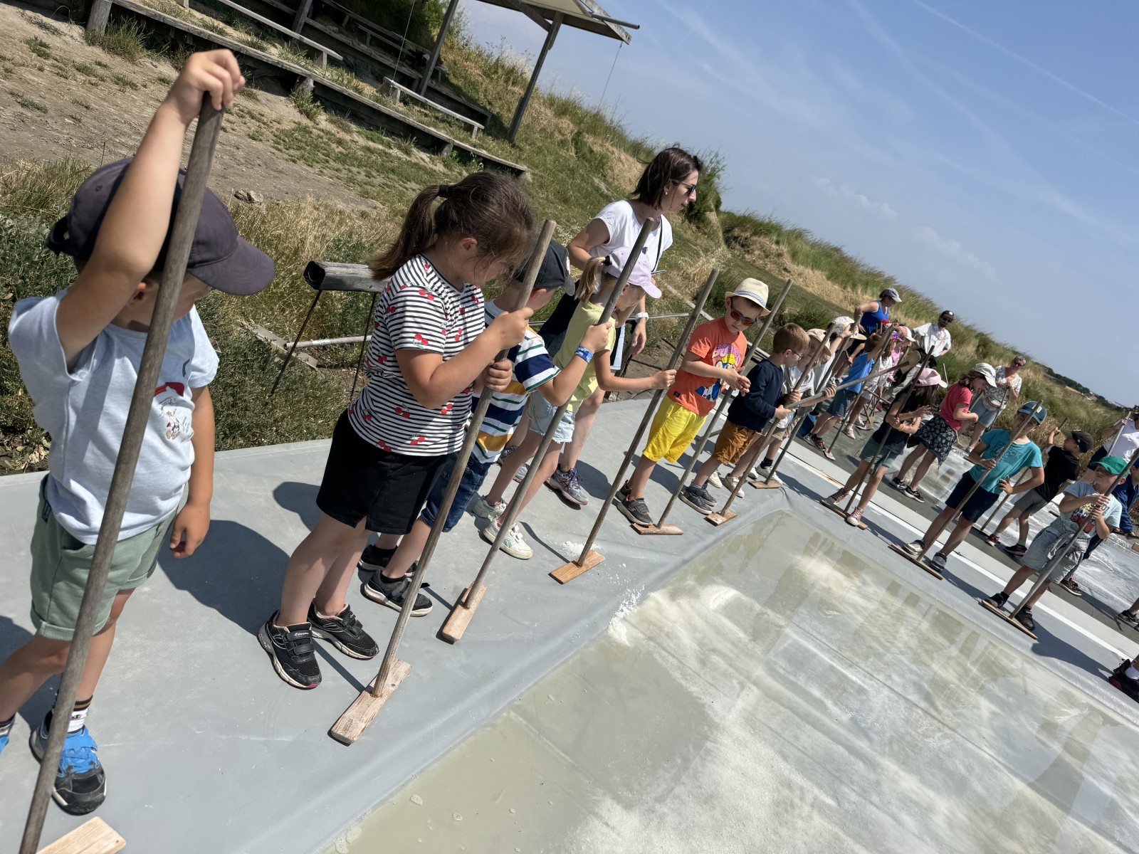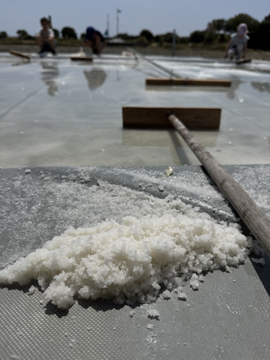 Puis, nous avons rencontré un saunier qui nous a expliqué son métier, les différentes récoltes (gros sel, fleur de sel, le sel), ses outils… Nous avons testé le métier en utilisant la simouche pour récolter le sel et rapporter chacun son petit sachet.