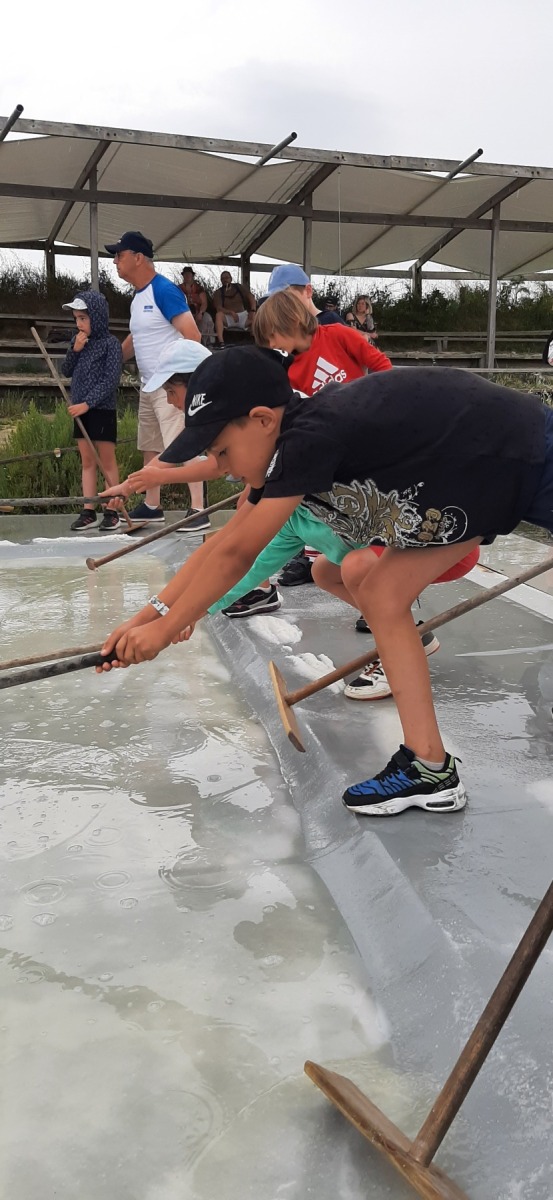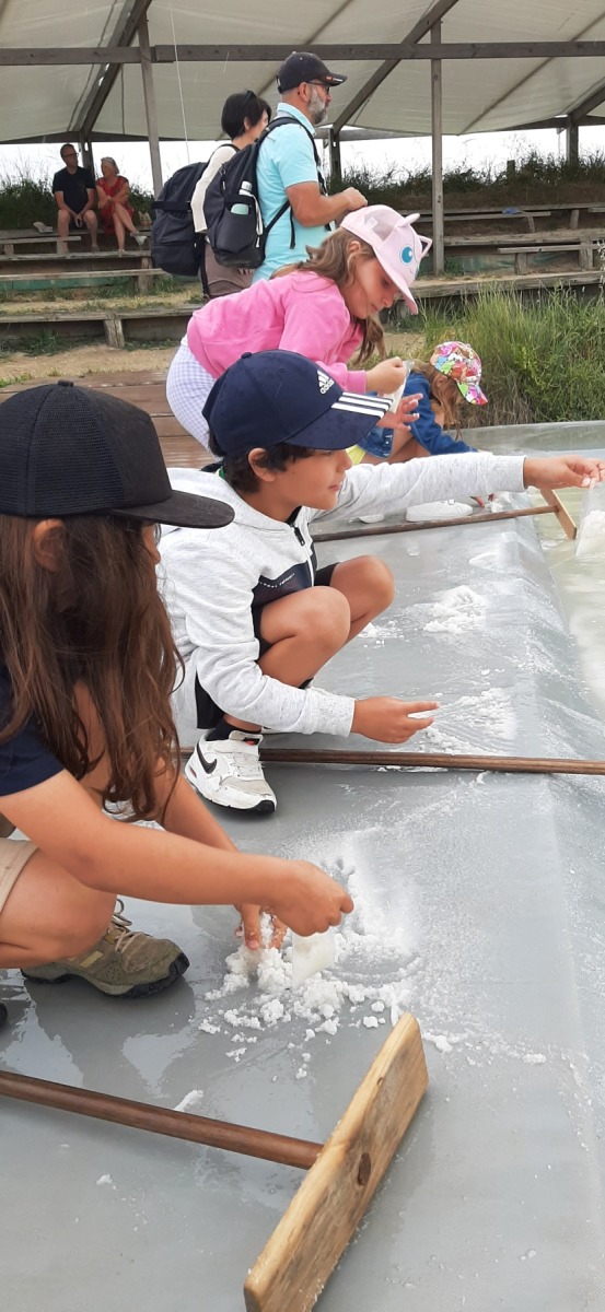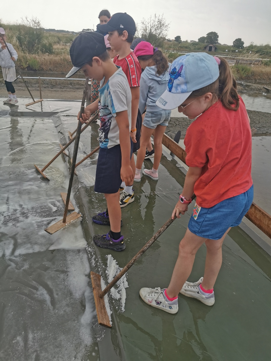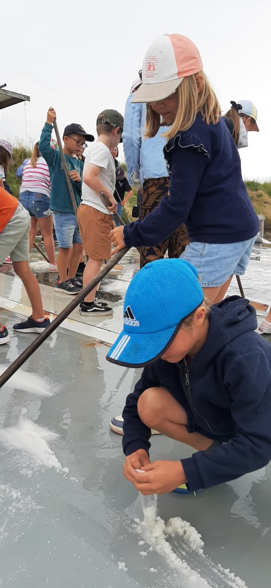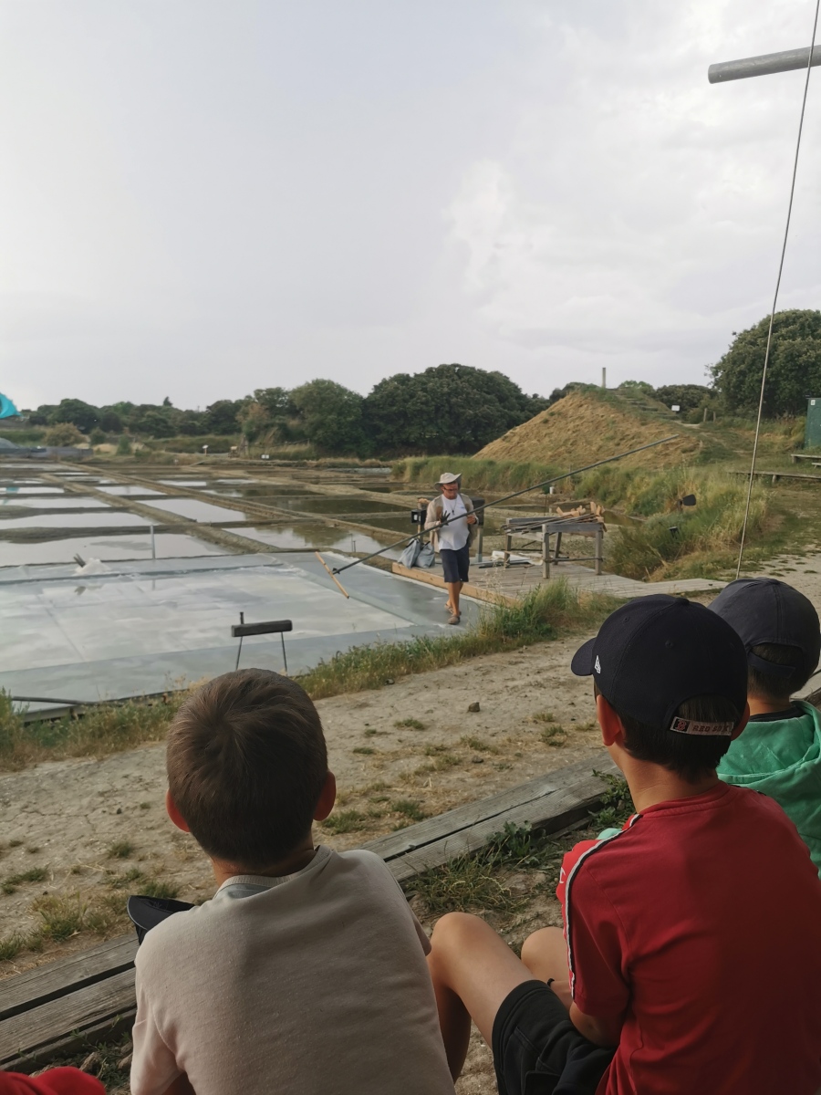 A notre arrivée au parc des Salines, un saunier nous a expliqué son métier mais aussi le fonctionnement des marais salants : en été, il récolte le sel laissé par l’eau de mer qui s’est évaporée grâce au soleil et au vent. Chacun des élèves a pu récolter son sel grâce à une simouche.