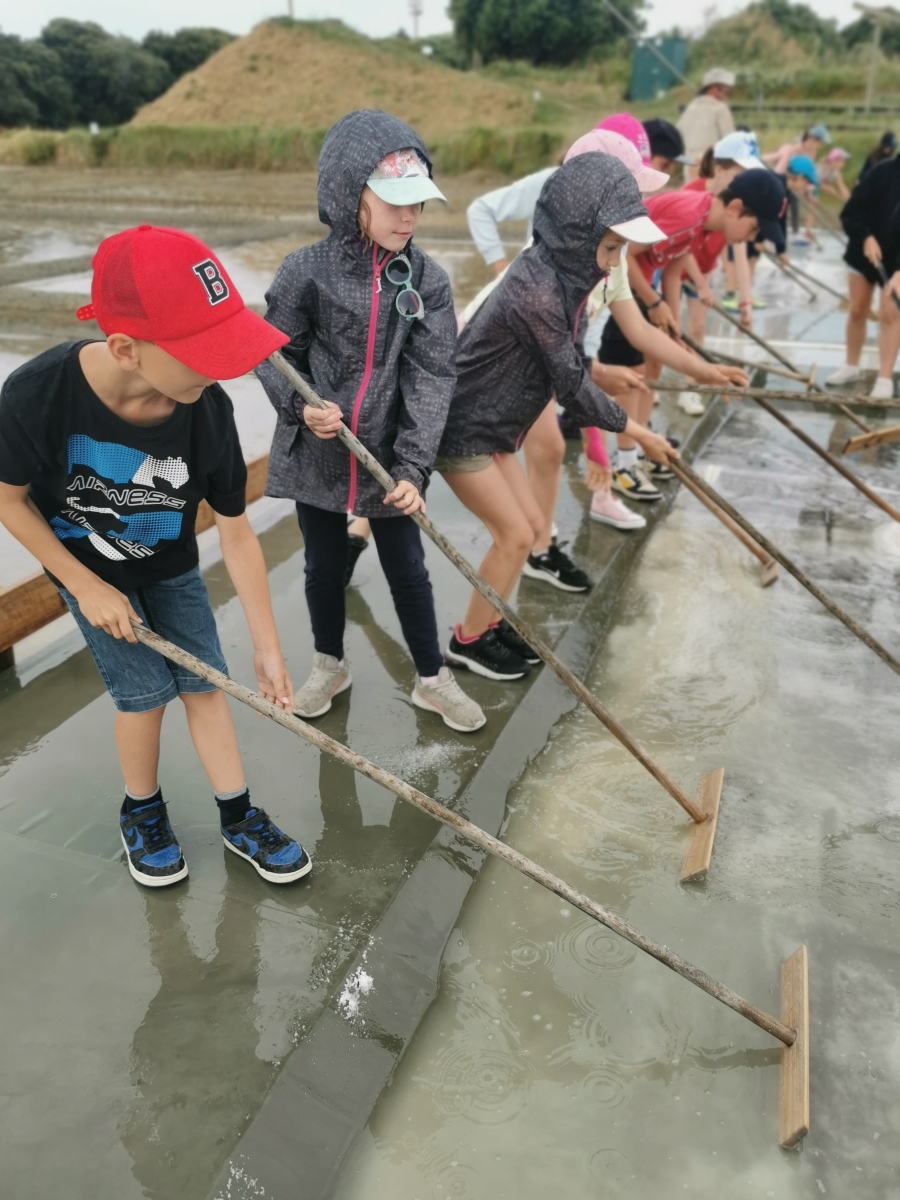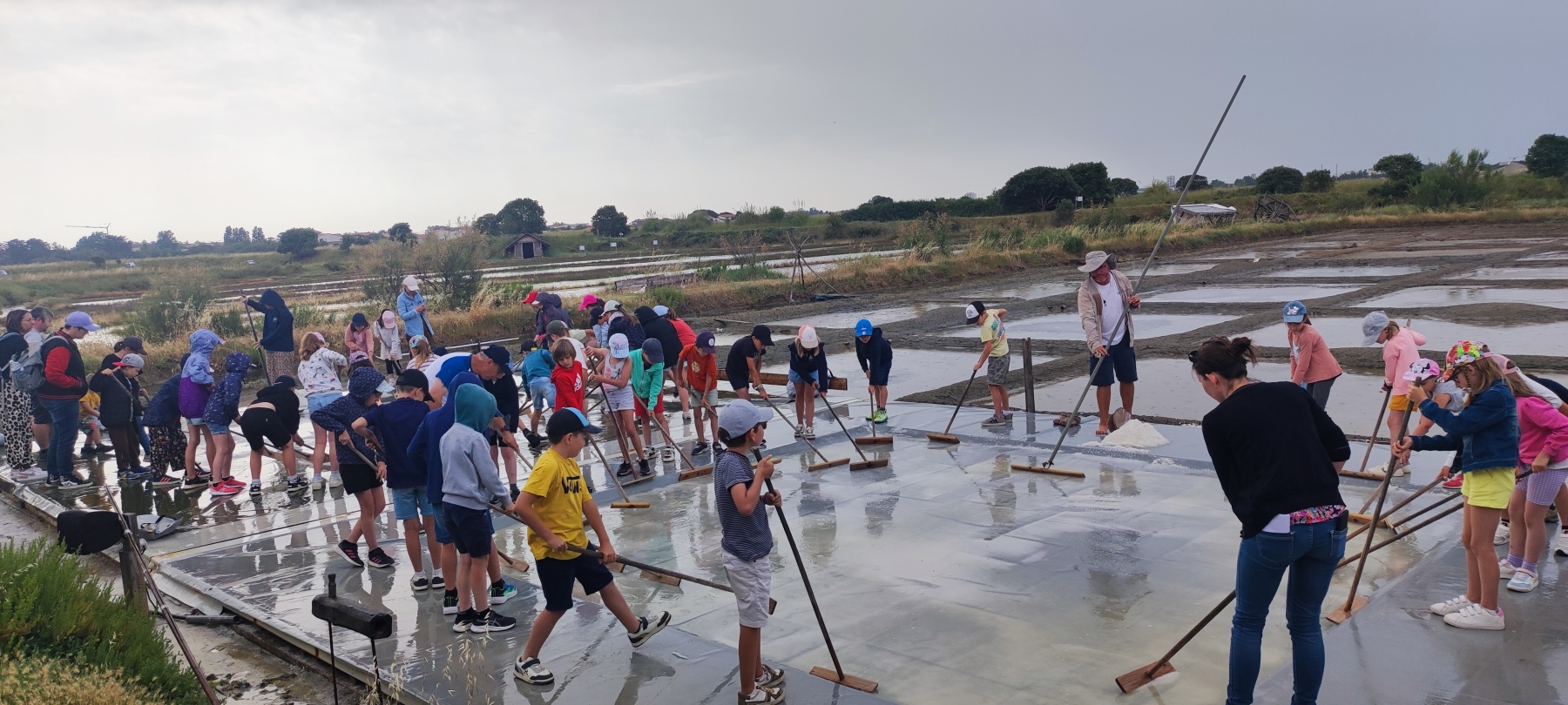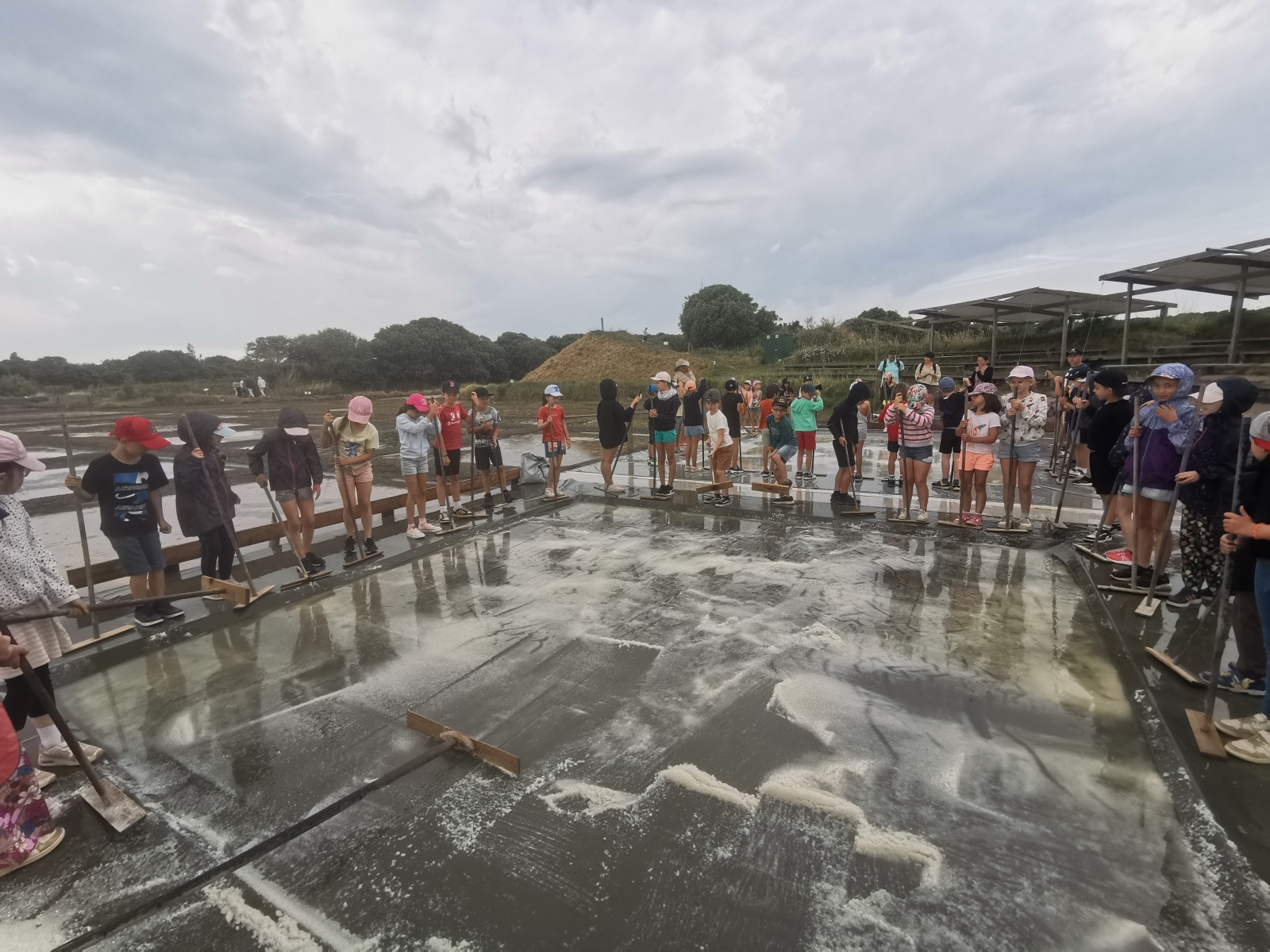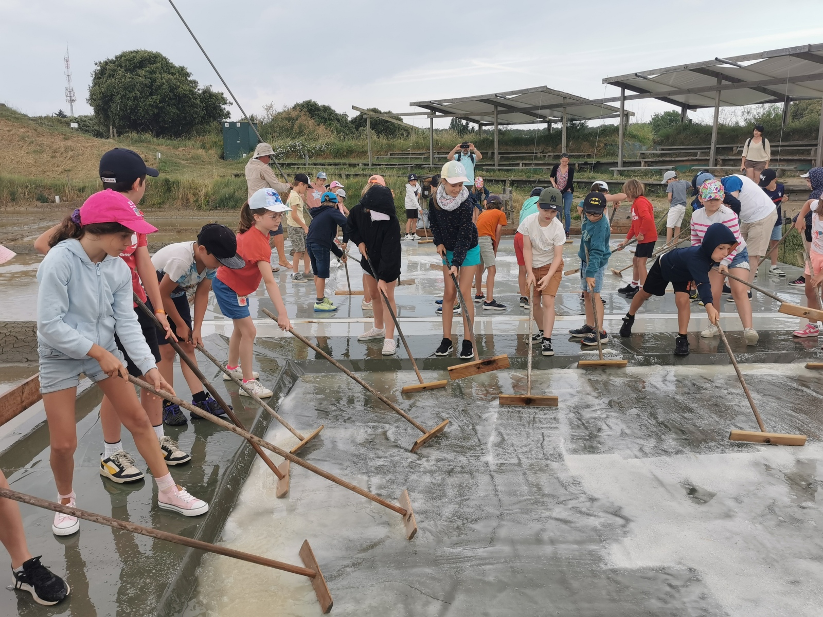 A notre arrivée au parc des Salines, un saunier nous a expliqué son métier mais aussi le fonctionnement des marais salants : en été, il récolte le sel laissé par l’eau de mer qui s’est évaporée grâce au soleil et au vent. Chacun des élèves a pu récolter son sel grâce à une simouche.