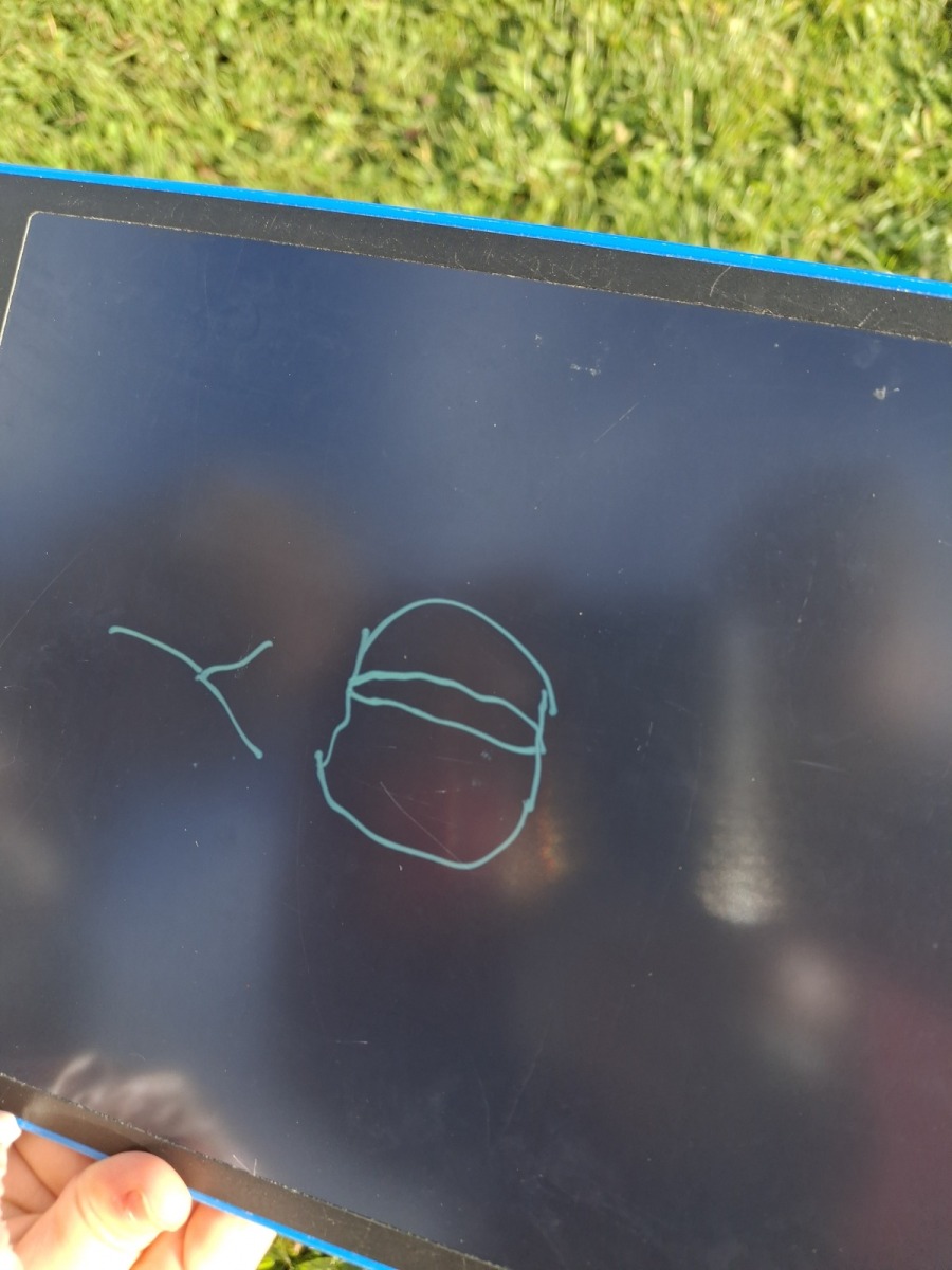 Explications du jeu : courir vers le cerceau, observer une image, la retourner, revenir dans son équipe, dessiner sur l’ardoise la partie du corps observée pour la faire deviner à ses camarades.